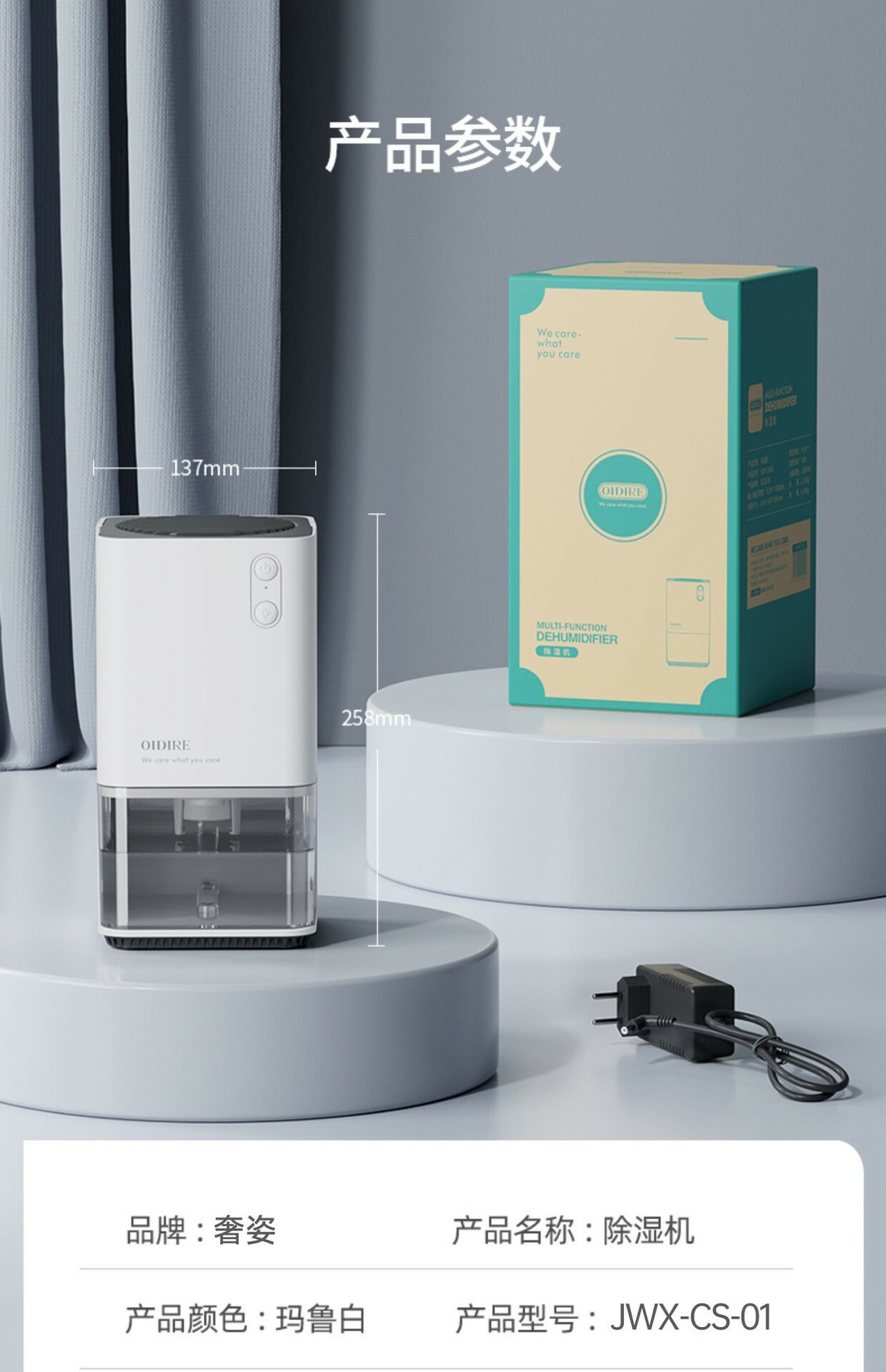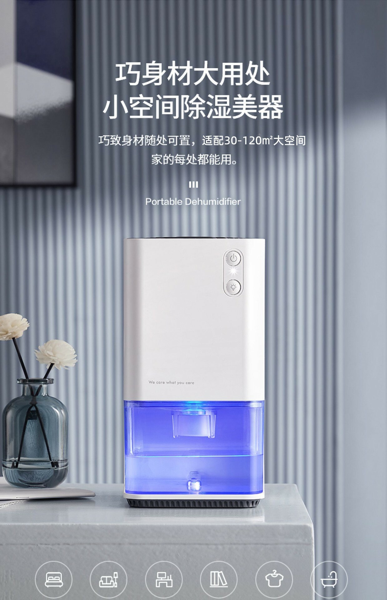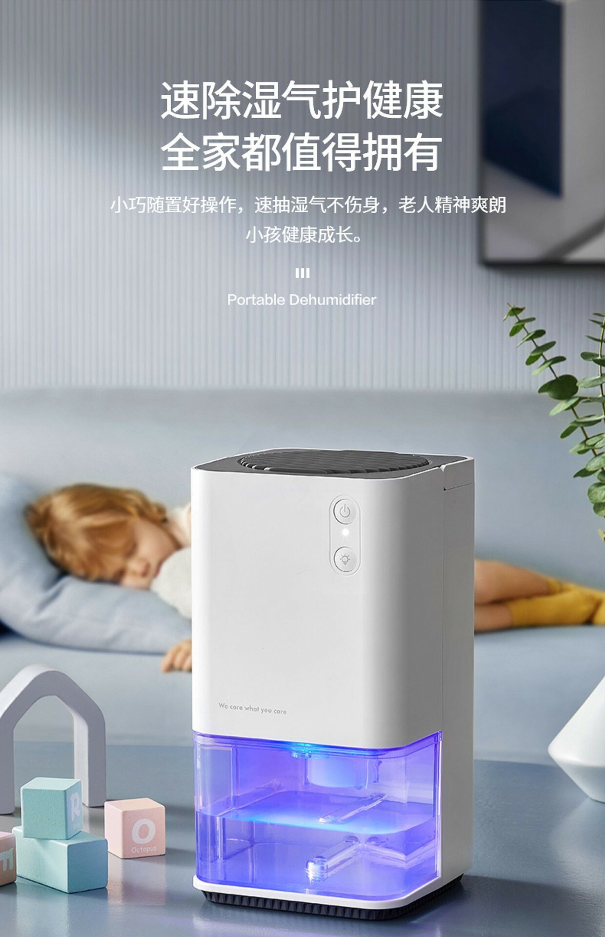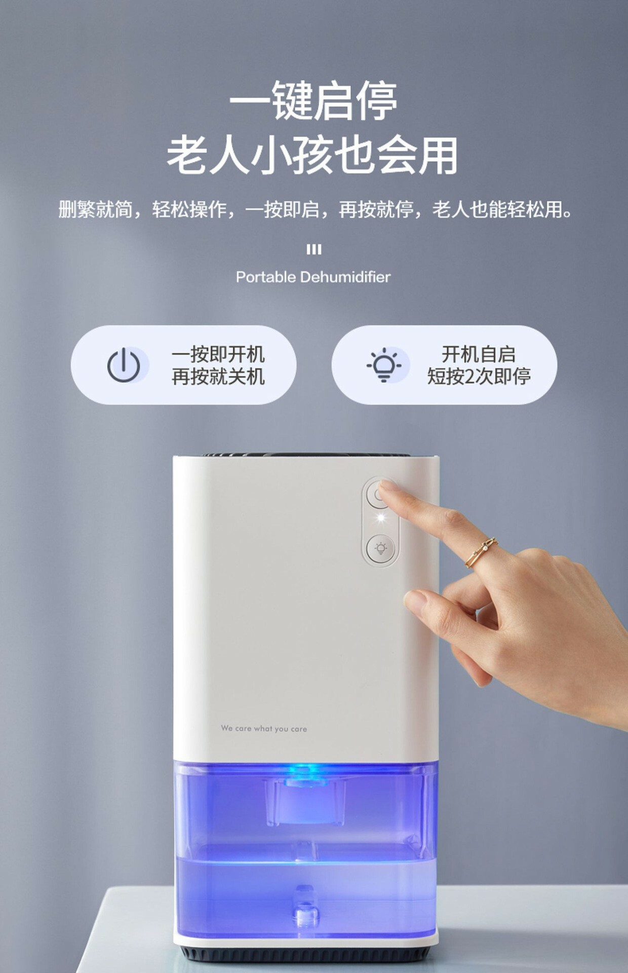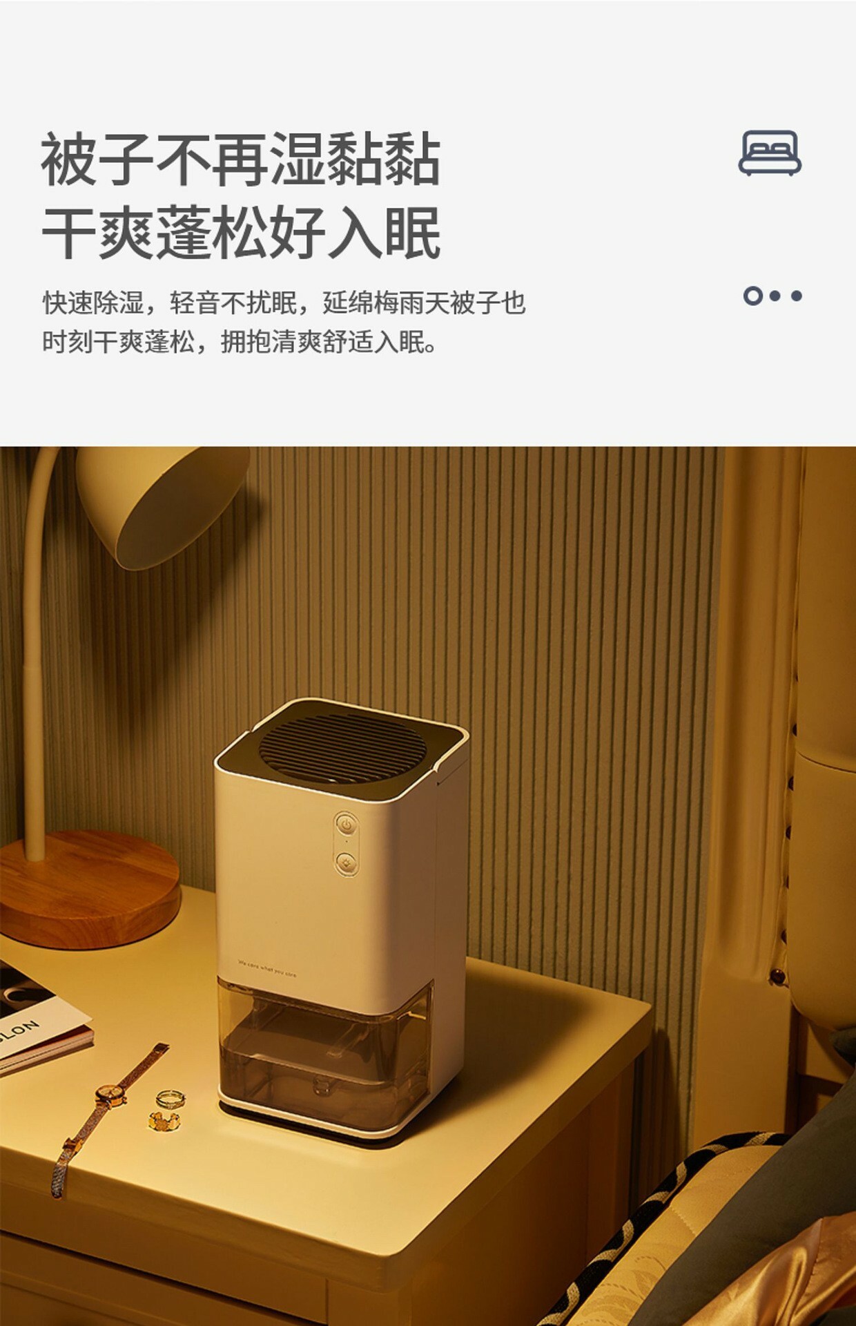 產品功能: 一健開啟,1.2L可視大水箱,半導體冷凝技術,低溫冰凝,長效除濕,省時省電,小巧便攜